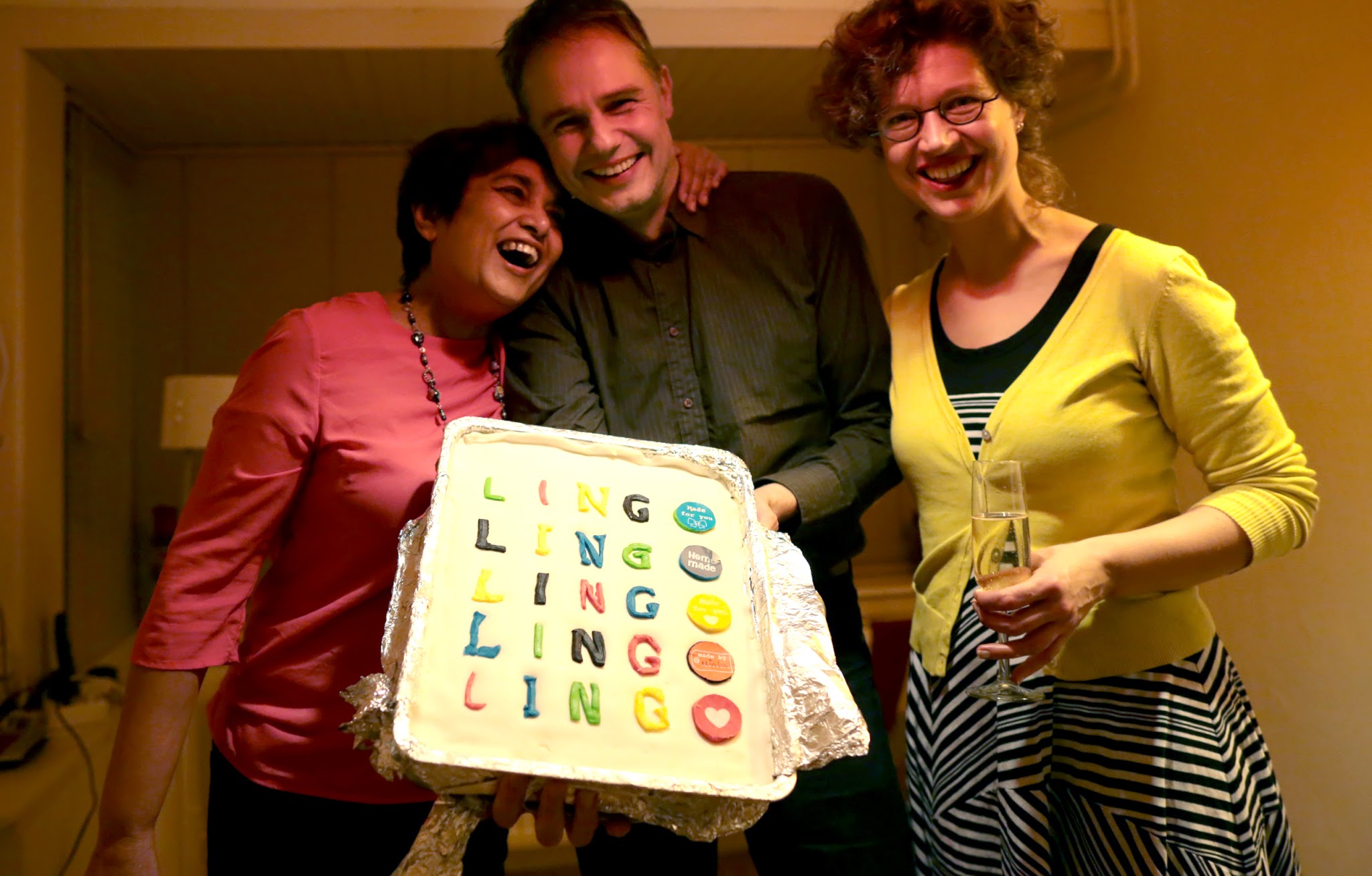 When Lingo came out in 2014, my wife threw a surprise party, with friends, relatives and a professor. She sang a song in my mother tongue, the publisher sent a congratulatory video and a friend baked a Lingo cake.